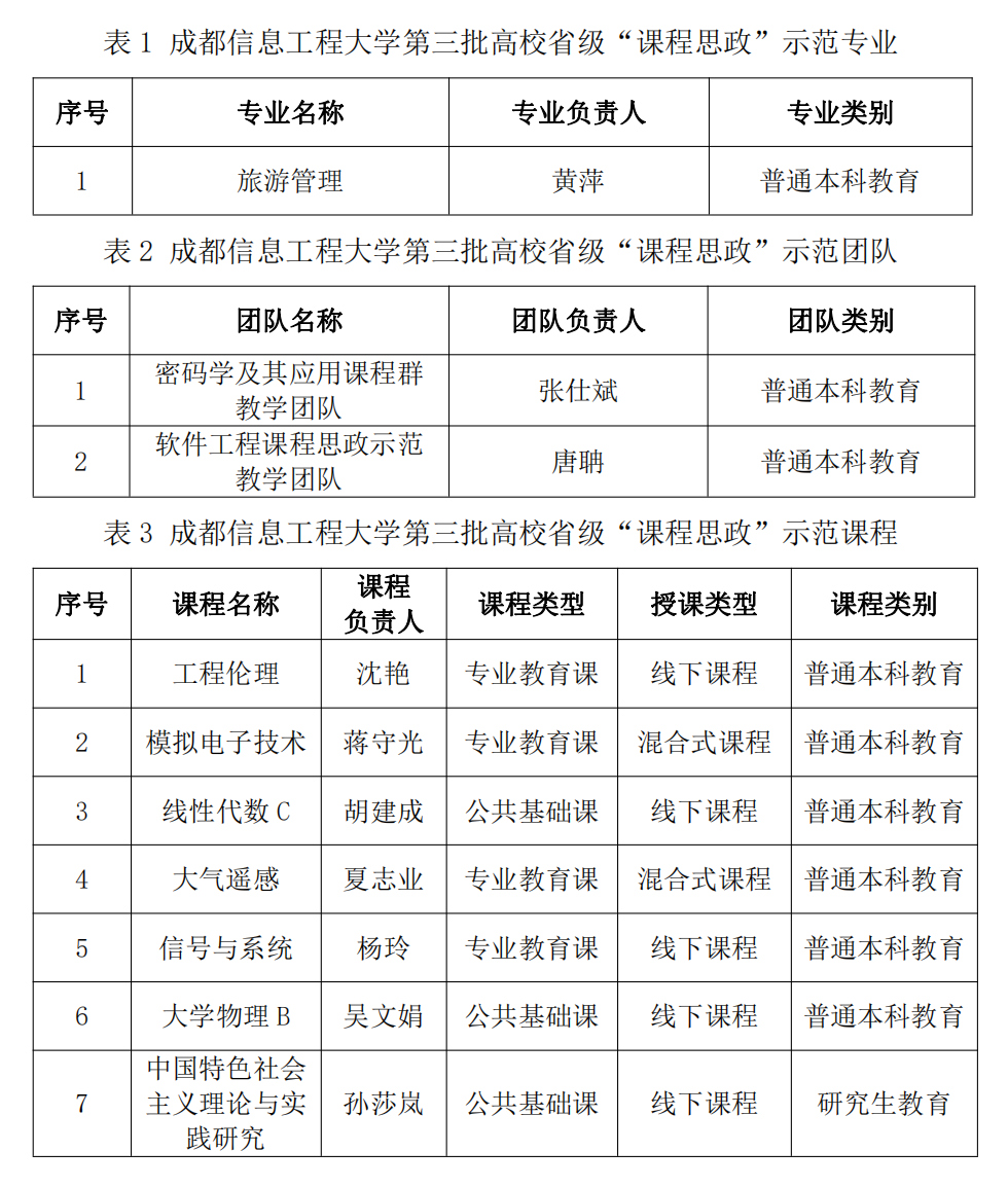 williamhill中国官方网站旅游管理专业被认定为省级“课程思政”示范专业;密码学及其应用课程群教学团队、软件工程课程思政示范教学团队被认定为省级“课程思政”示范教学团队;《工程伦理》《模拟电子技术》《线性代数C》《大气遥感》《信号与系统》《大学物理B》《中国特色社会主义理论与实践研究》7门课程被认定为省级“课程思政”示范课程,其中《中国特色社会主义理论与实践研究》为研究生教育课程。详见下表。
