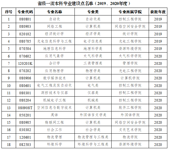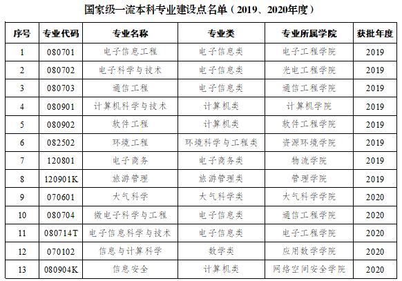 学校入选2020年度国家级一流本科专业建设点的5个专业:大气科学、微电子科学与工程、电子信息科学与技术、信息与计算科学、信息安全。