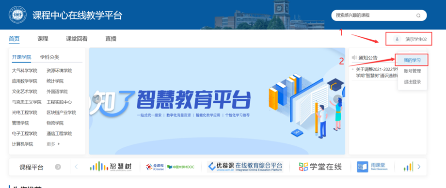 1、登录成功后,鼠标放在登录账号或者头像位置,出现下拉框后点击“我的学习”,然后进入我的学习页面。