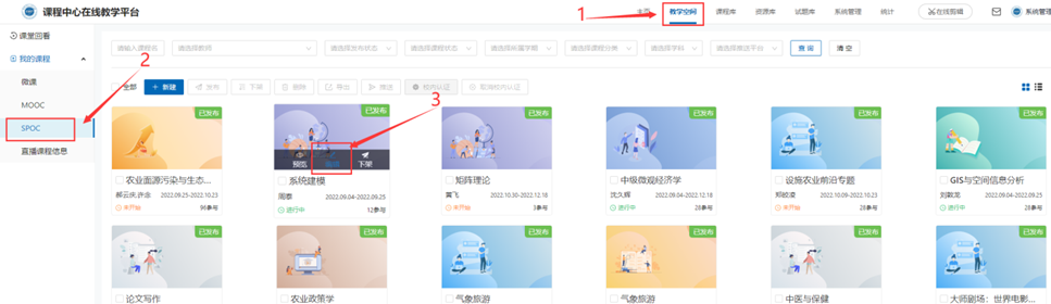 注意:如教师在“课程中心”首页要进入课程编辑页面,需要将鼠标放于右侧头像位置,出现下拉框点击“工作台”,然后进入主页,再点击“教学空间”-SPOC课程。