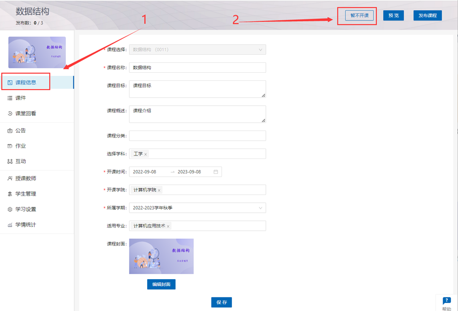 操作如下:进入课程编辑页面,点击左侧的“课程信息”,然后点击右上角的“暂不开课”按钮。