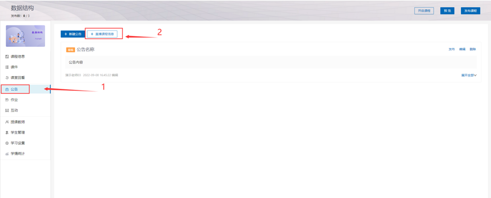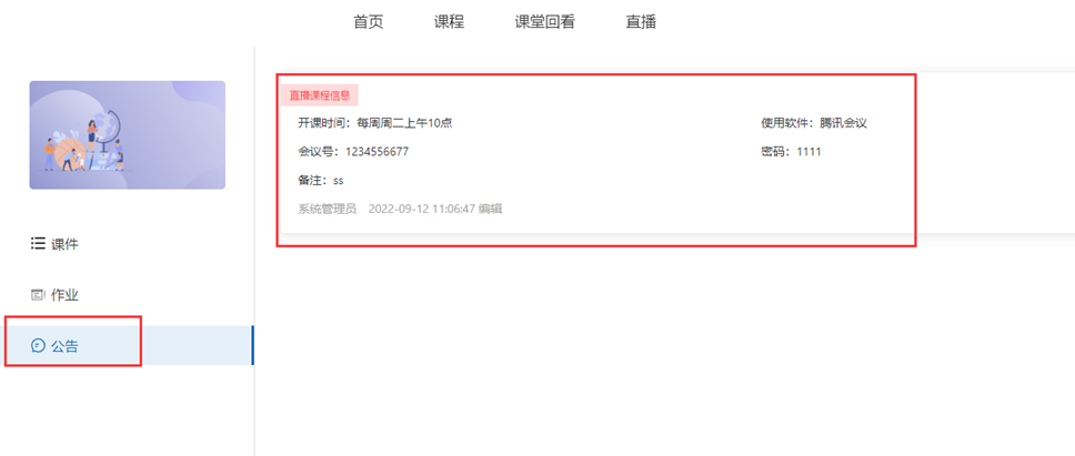 点击左侧“公告”-“直播课程信息”,在弹出的窗口输入直播课程相关信息,然后点击“保存”按钮。如使用腾讯会议,建议会议室开设为周期会议,保证会议号不变,避免后续更新。备注信息可填写QQ群号等其他需公布的上课信息。