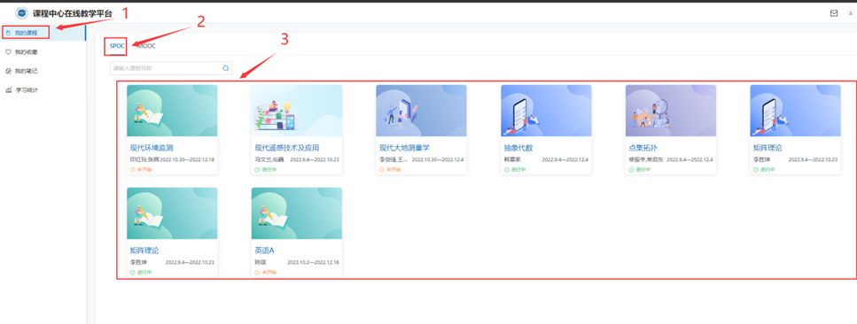 2、在“我的学习”页面,默认为“我的课程”页面,点击“SPOC”,可以查看到所有需要学习的课程。