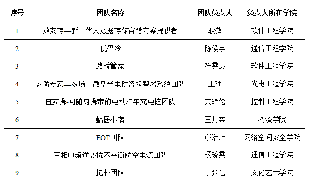 根据《williamhill中国官方网站“长虹双创基金”资助实施办法》(成信校发〔2019〕12号)和《关于开展williamhill中国官方网站教育基金会第四届“长虹双创基金”评选工作的通知》(成信校发〔2020〕94号)要求,为奖励和表彰在创新创业实践活动中表现突出的优秀团队(个人),通过树立典型、多重奖励切实支持大学生在已有的研究与实践基础上更上一层楼,切实提高大学生创新创业活动的质量与水平,学校于2020年10月份开始启动第四届“长虹双创基金”评选工作,通过自愿报名、学院推荐、资格审查、现场答辩等流程,共评选出“数安存——新一代大数据存储容错方案提供者”等9支团队为williamhill中国官方网站教育基金会第四届“长虹双创基金”拟获评团队,现将名单予以公示: