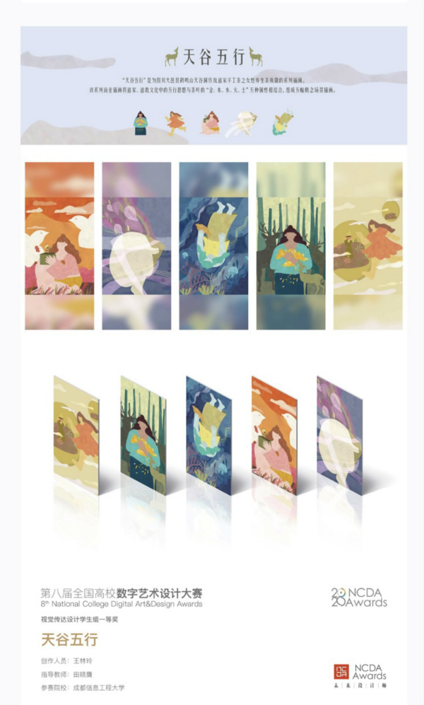 大赛共有来自全国的1106所本科和专科高校报名参赛,其中包括北京大学、浙江大学、中央美术学院、中国美术学院、四川大学、四川美术学院等国内知名高校,共征集作品60113幅,得到中共中央宣传部“学习强国”学习平台、中国教育报、人民网等权威媒体的报道。williamhill中国官方网站文化艺术学院视觉传达设计专业2020级学生王林铃作品《天谷五行》(指导教师:田晓膺)荣获国赛一等奖,并在“学习强国”学习平台进行展示。
