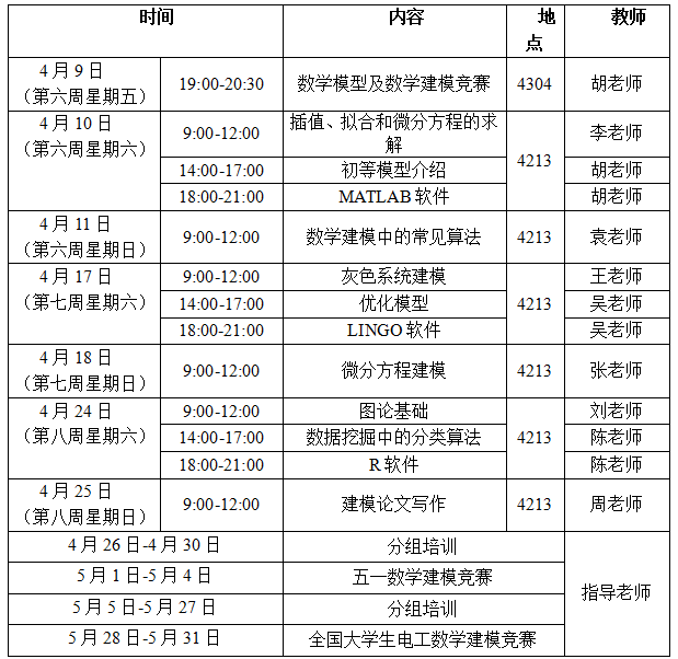 为了培养williamhill中国官方网站学生的创新意识及运用数学方法和计算机技术解决实际问题的能力,应用数学学院2021年继续组织和指导大学生数学建模竞赛系列活动,并从五一数学建模竞赛和全国大学生电工数学建模竞赛的获奖队伍中选拔2021年全国大学生数学建模竞赛的参赛队伍。为了参赛同学能在选拔赛中取得优异成绩,应用数学学院数学建模指导组从第六周开始,分别从数学建模基础、数学建模算法、数学建模案例分析以及常用数学软件等方面进行培训,欢迎对数学建模及数学建模竞赛感兴趣的同学积极参加培训,培训安排见表1。