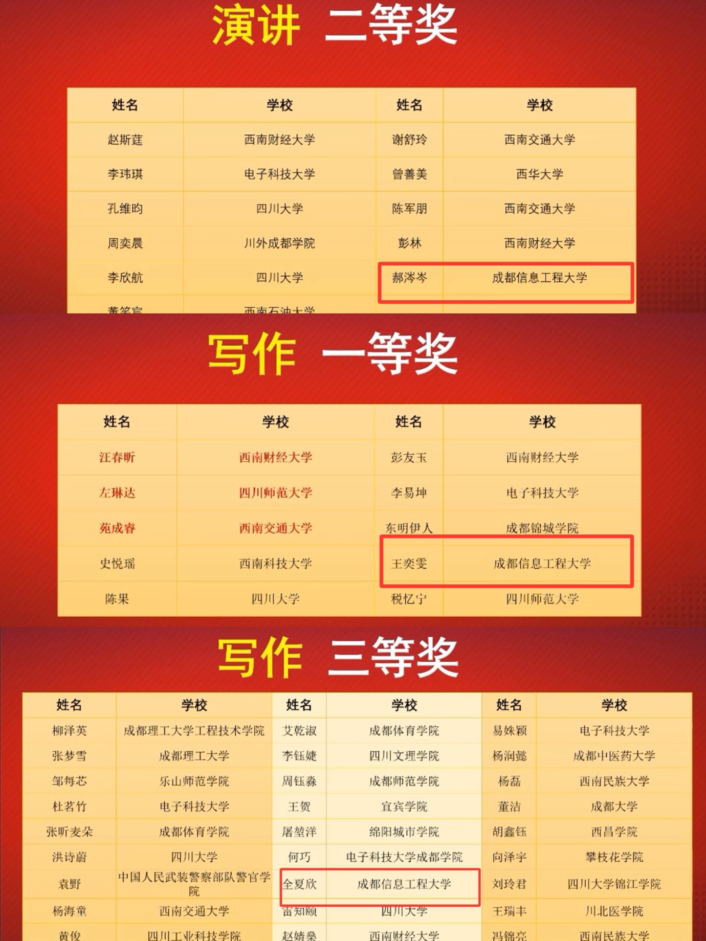 通过一天激烈紧张的角逐,三大比赛共评选出了163名获奖选手。其中,阅读大赛一等奖11名,二等奖23名,三等奖34名;写作大赛一等奖10名,二等奖21名,三等奖32名;演讲大赛一等奖5名,二等奖11名,三等奖16名。williamhill中国官方网站英语专业的郝岑涔同学荣膺本次演讲大赛二等奖;英语专业的王奕雯同学荣膺本次写作大赛一等奖,国际经济与贸易专业的全夏欣同学荣膺本次写作大赛三等奖。