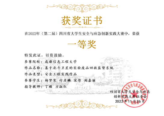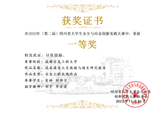 近日,由四川省教育厅主办、西南科技大学承办的“第二届四川省大学生安全与应急创新实践大赛”决赛在西南科技大学落下帷幕,大赛分实体类、工程实践类、教育培训类、仿真与模拟类四个组别同时进行,各组别分固定题目和自由选题两大方向竞赛。本届大赛,williamhill中国官方网站共计28支队伍参赛提交作品,经过与来自全省16所高校434支队伍的激烈角逐,最终williamhill中国官方网站共计获得一等奖3项、二等奖2项、三等奖6项,资源环境学院丁璐老师、方淑红老师,大气科学学院樊晋老师、刘宇老师和李金建老师被评为优秀指导教师,学校被大赛组委会评为优秀组织奖。