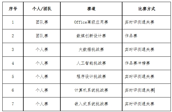 第五届全国高校计算机能力挑战赛分设大数据挑战赛、人工智能挑战赛、Office高级应用赛、程序设计挑战赛、嵌入式系统设计挑战赛、计算机系统挑战赛和数字媒体创新设计七大赛项。