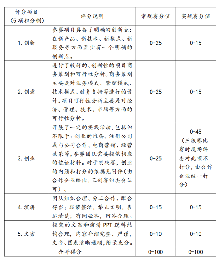 (3)第十四届三创赛分为常规赛和实战赛两类,这两类评价指标有所不同:实战赛的评价指标相对于常规赛的评价指标不同的是,实战赛的创业分值由25分提高到45分,创新分值和创意分值由25分各降低到15分。